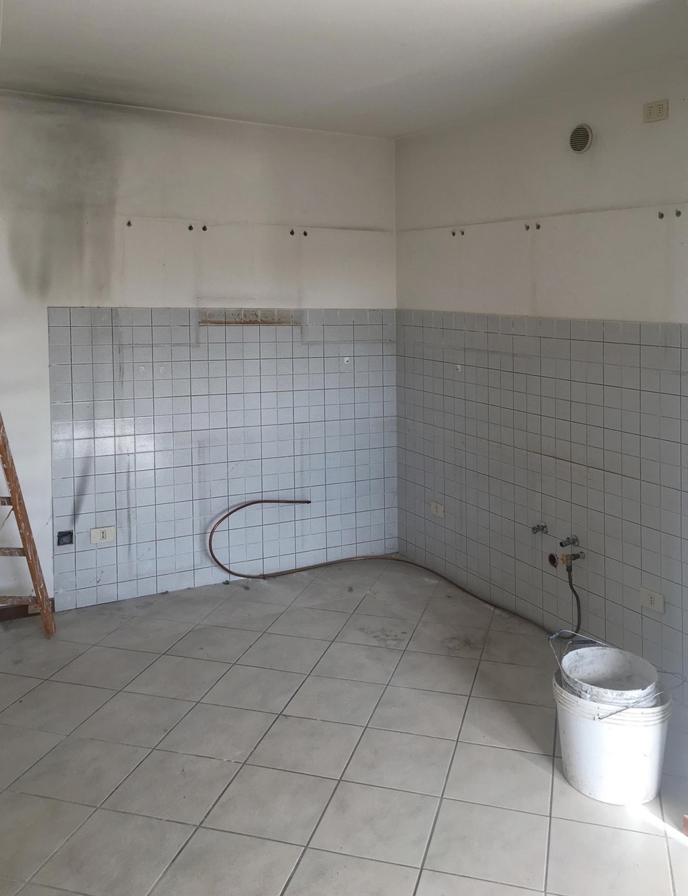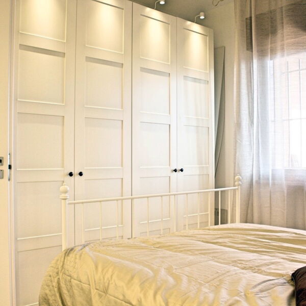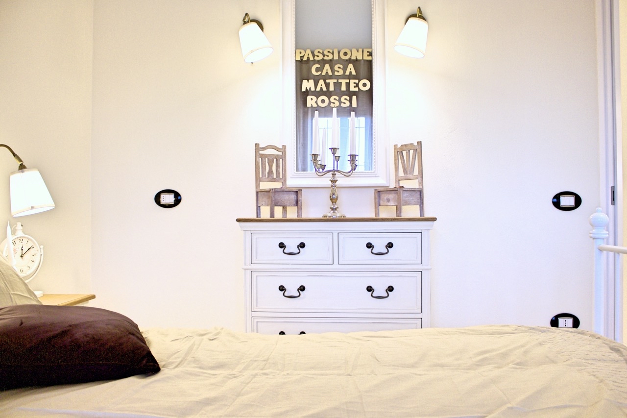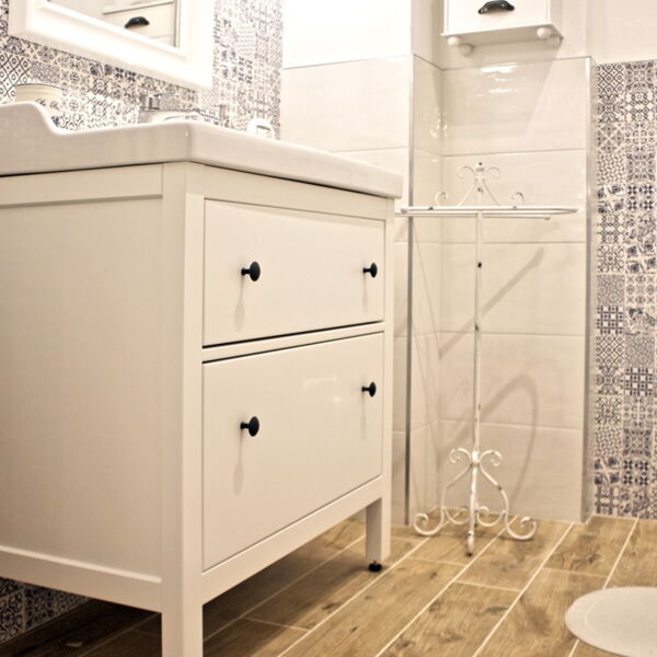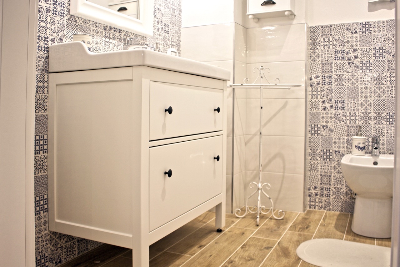 Rifacimento completo di bagno, montaggio di porte nuove, lavori di cartongesso, rifacimento impianto elettrico e imbiancatura, arredamento.