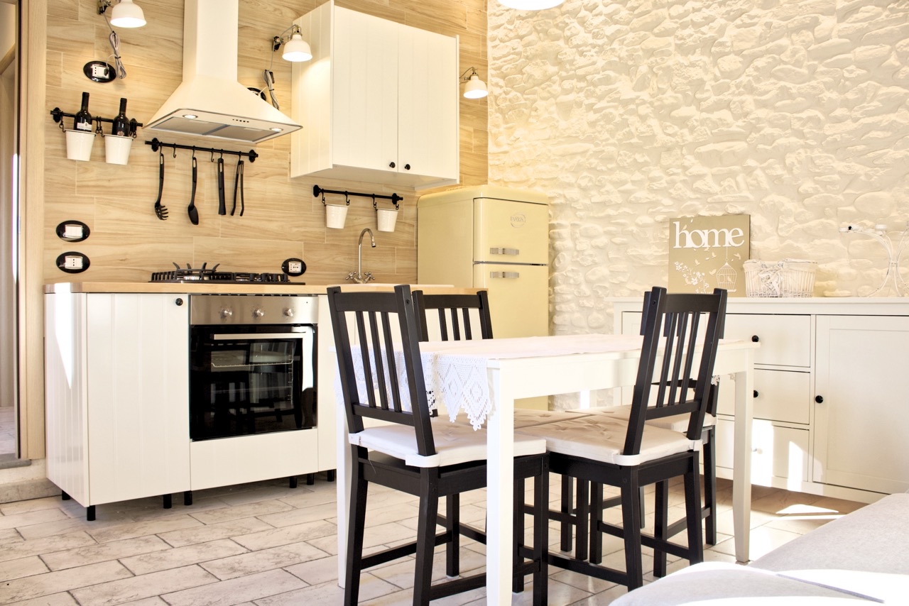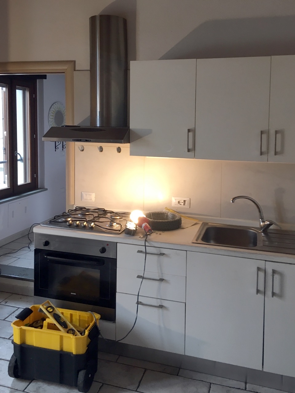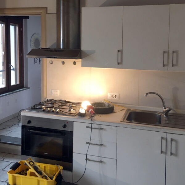 Rifacimento cucina con montaggio piastrelle, rifacimento impianto elettrico, controsoffitti con cartongesso, sostituzione caldaia, arredamento.
